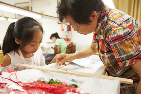 中国刺绣艺术大师梁桂开向小学员讲解怎样下针、定针