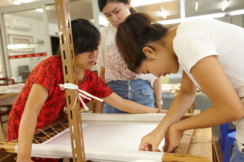 广绣技师梁淑萍向学员们讲解绣布上架的方法